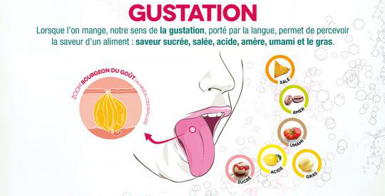 Les cinq saveurs de base sont : le sucré, l’acide, le salé, l’amer et l’umami et sont perçues par les papilles gustatives de la langue.